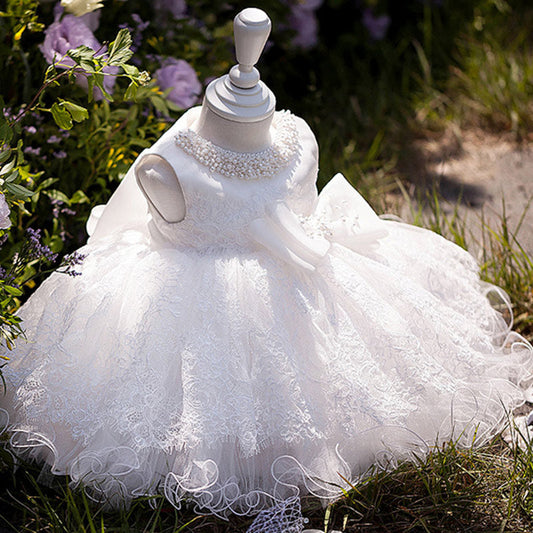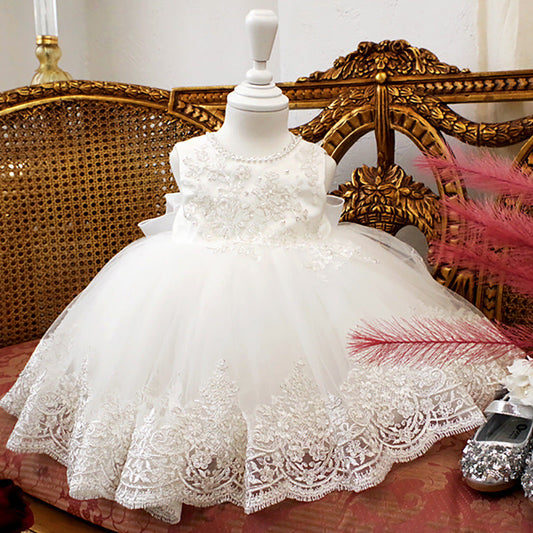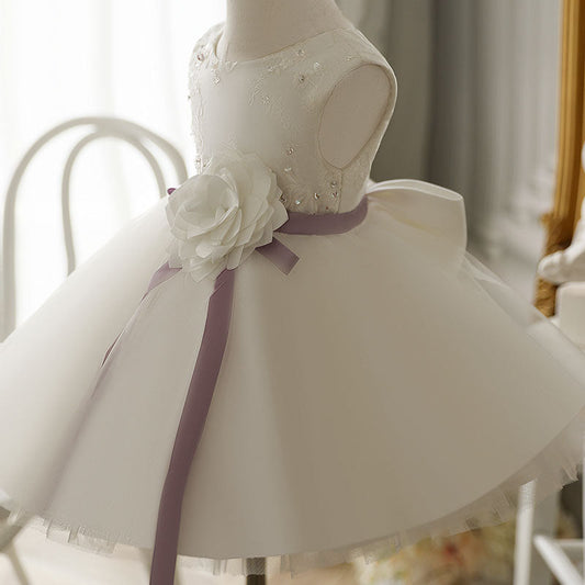 White Lace Princess Flower Girl Dress: Sleeveless Bow Back