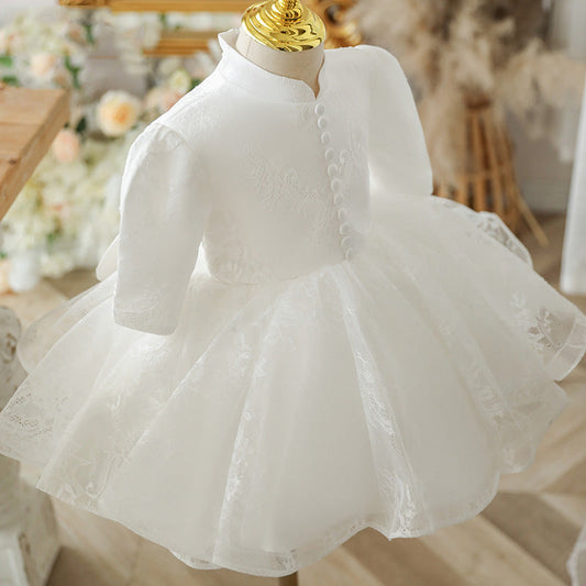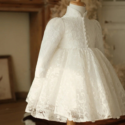 White Lace Princess Flower Girl Dress Mock Neck Lantern Sleeve