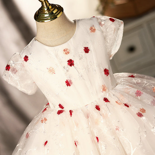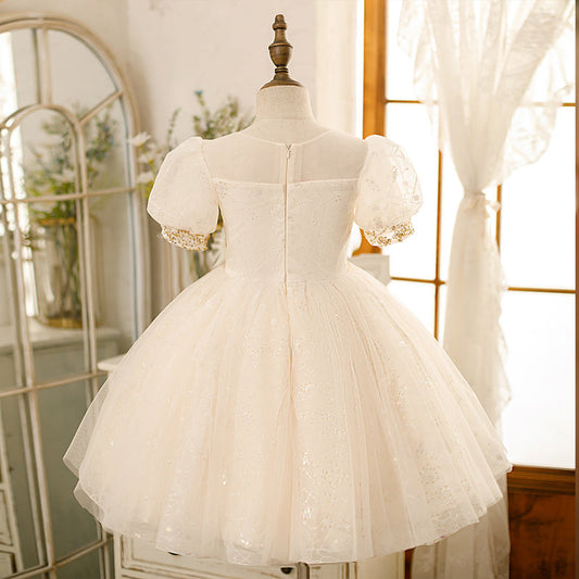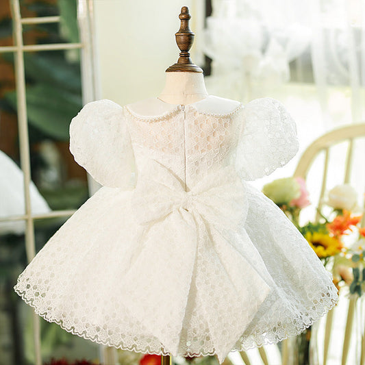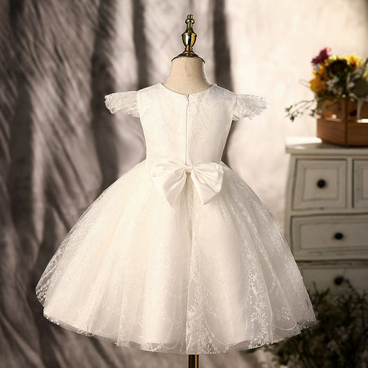 White Lace Princess Flower Girl Dress Short Puff Sleeve Tea