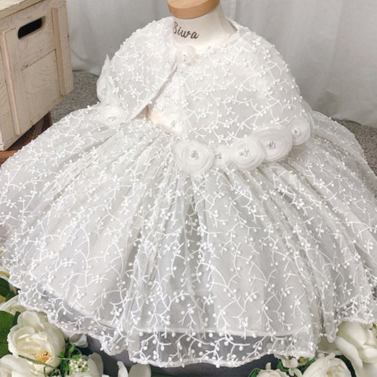 White Lace Princess Tea-Length Flower Girl Dress with Ruffles