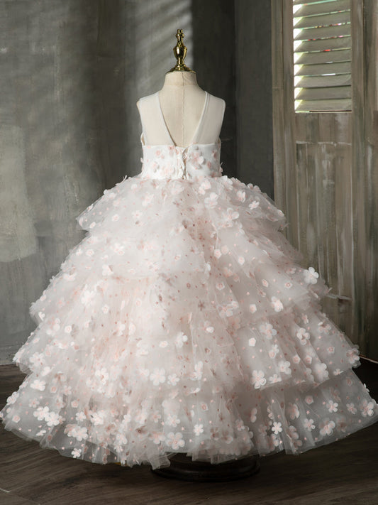 White Lace Princess Flower Girl Dress with Puff Sleeves and Flowers