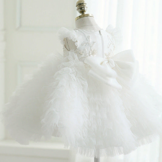 White Lace Princess Flower Girl Dress Beaded Sleeveless Tea