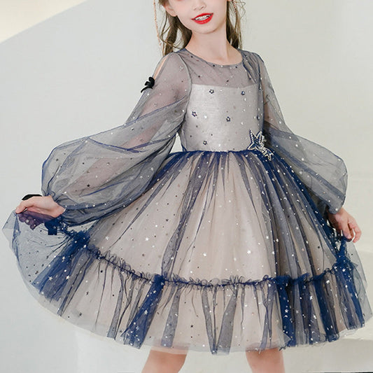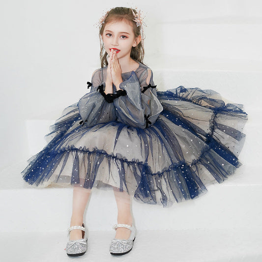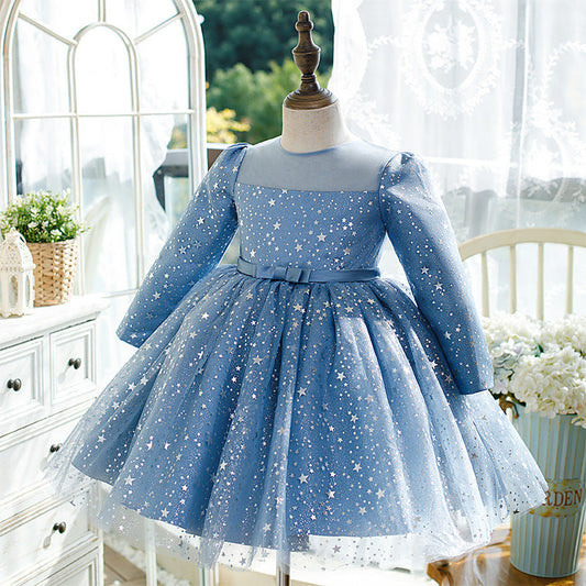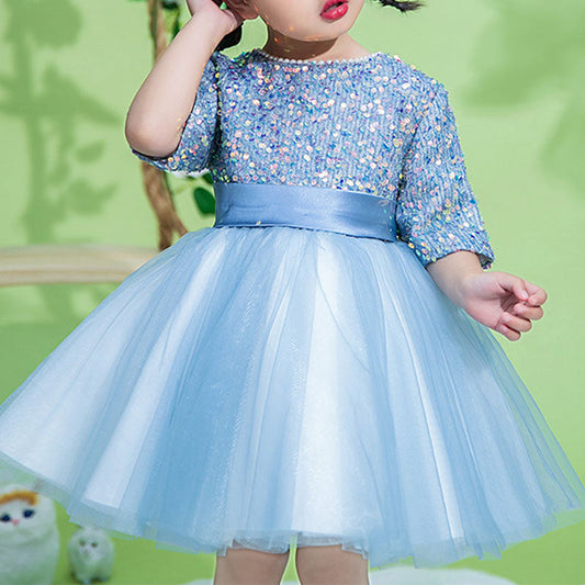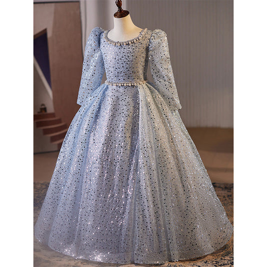 Blue Sequined Princess Flower Girl Dress Long Sleeve