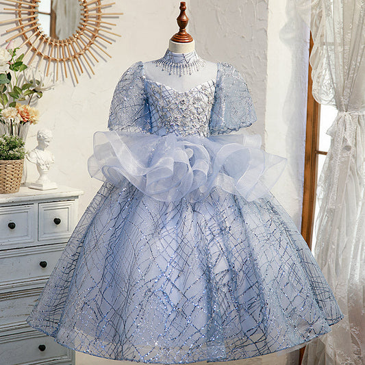 Blue Sequin Princess Flower Girl Dress Ruffles Mock Neck