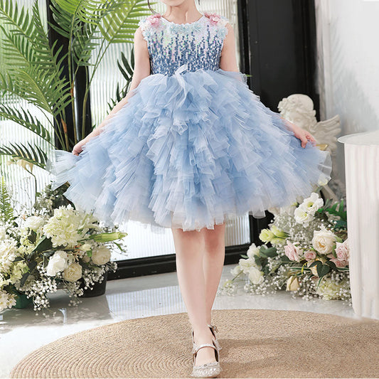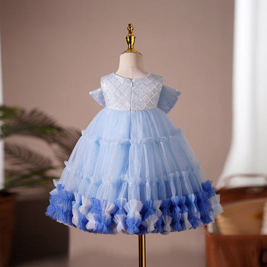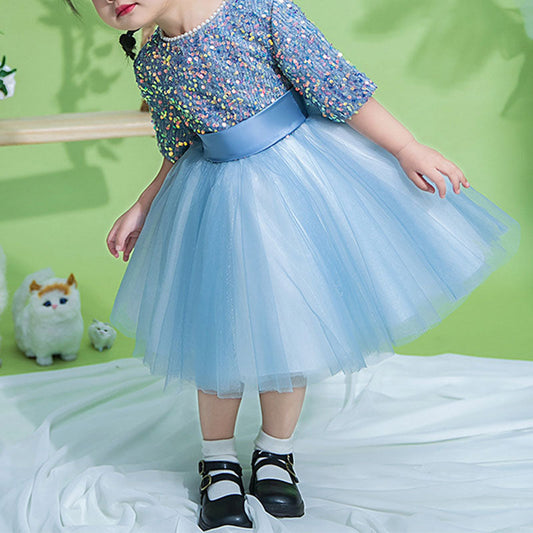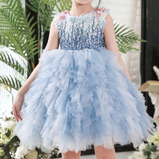 Blue Sequined Tiered Skirt Princess Dress for Girls