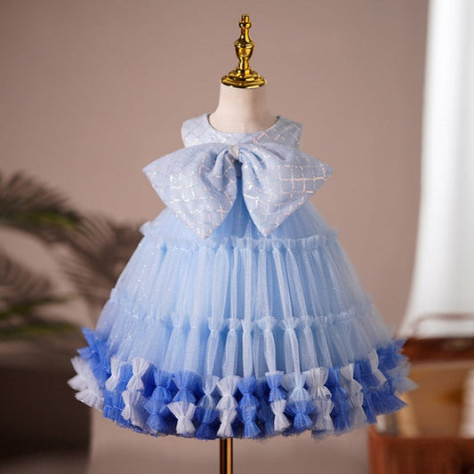 Blue Sequin Tulle Flower Girl Dress | Bow & Pleats