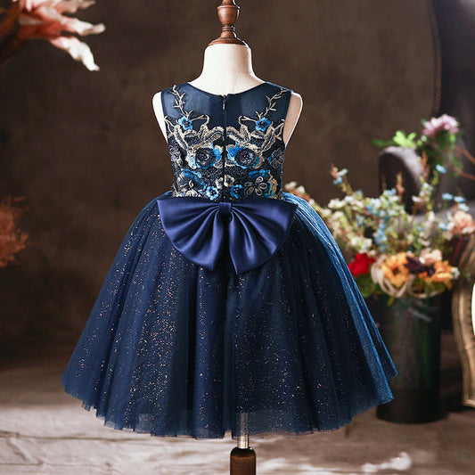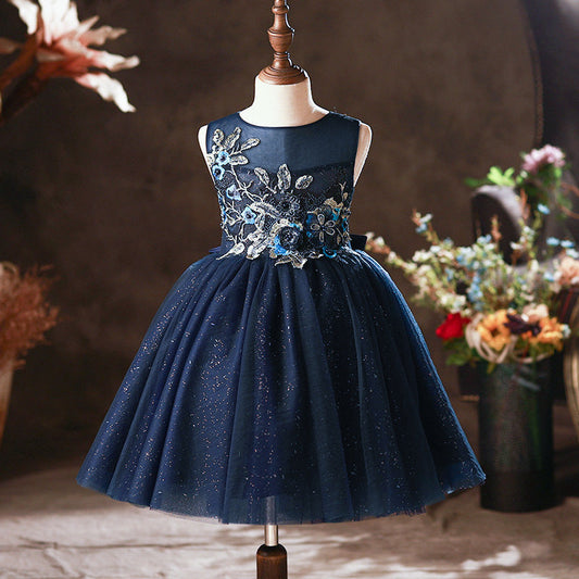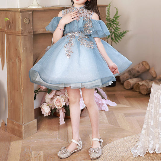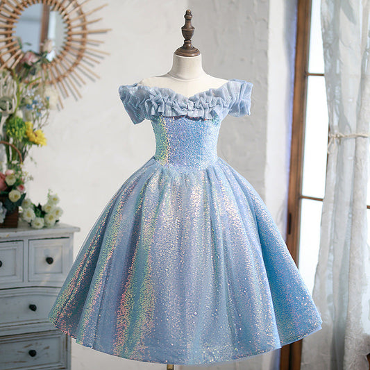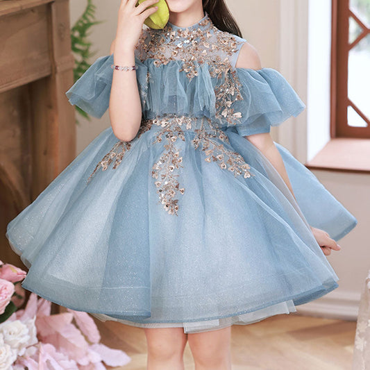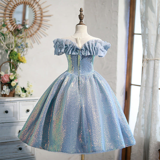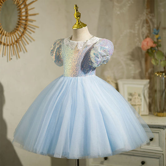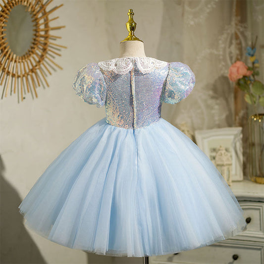 Blue Sequin Tulle Princess Flower Girl Dress Lace Puff Tea