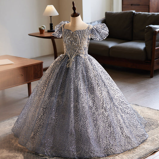 Blue Sequin Princess Flower Girl Dress with Beaded Puff Sleeves