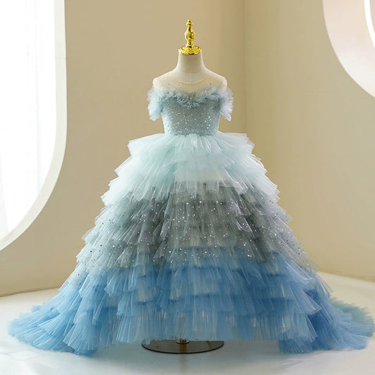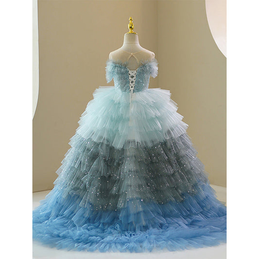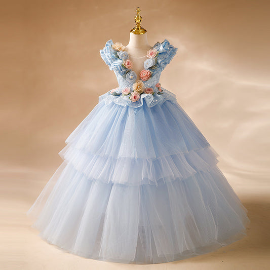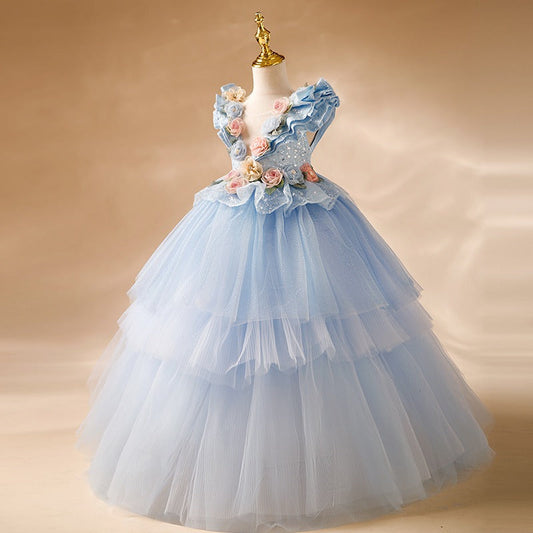 Blue Tulle Princess Flower Girl Dress with Lace & Sequins