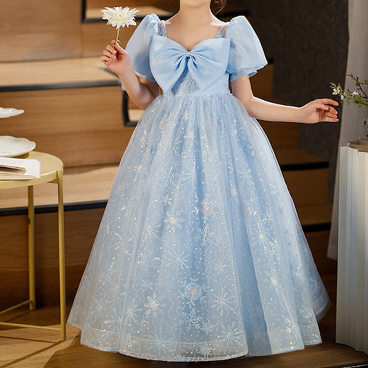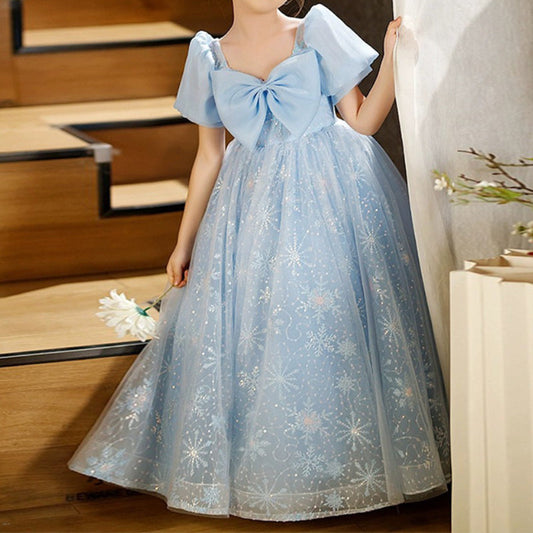 Blue Snowflake Princess Dress for Girls with Sequins and Bow