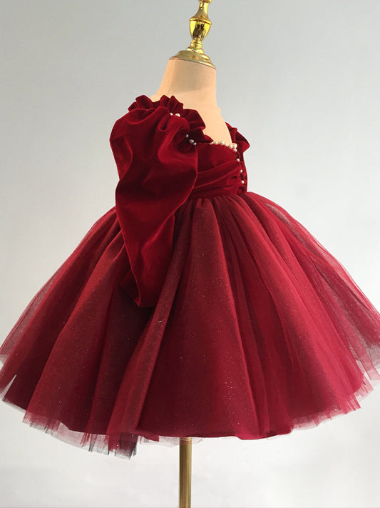 Burgundy A-Line Flower Girl Dress with Velvet and Tulle