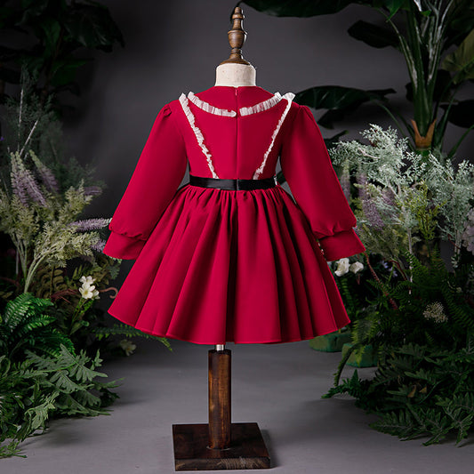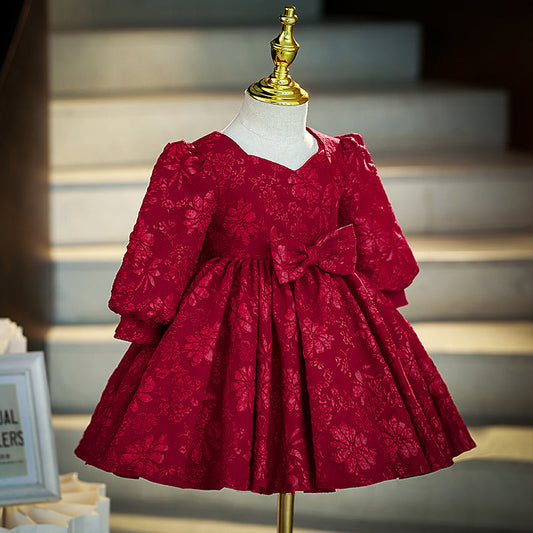 Burgundy Lace Princess Flower Girl Dress V-Neck Lantern Sleeve