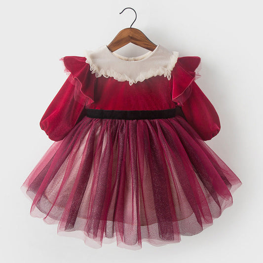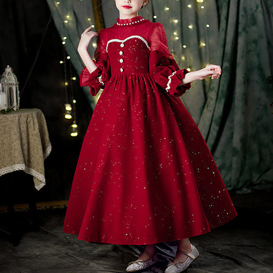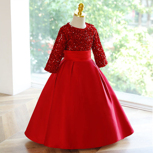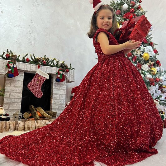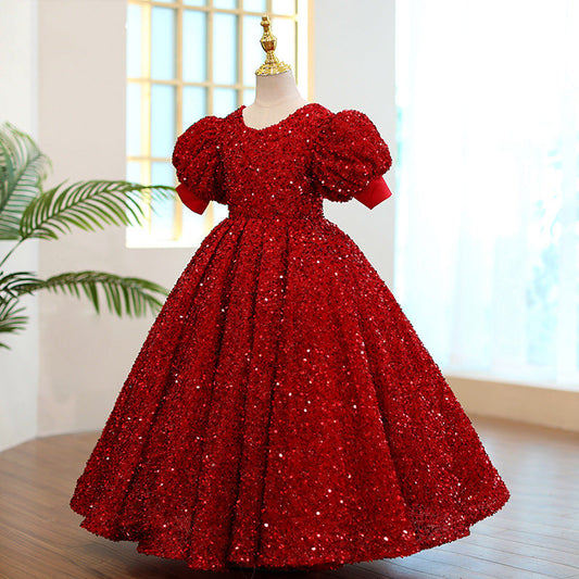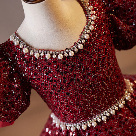 Burgundy Sequined Princess Flower Girl Dress Lace Beaded