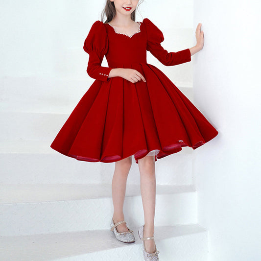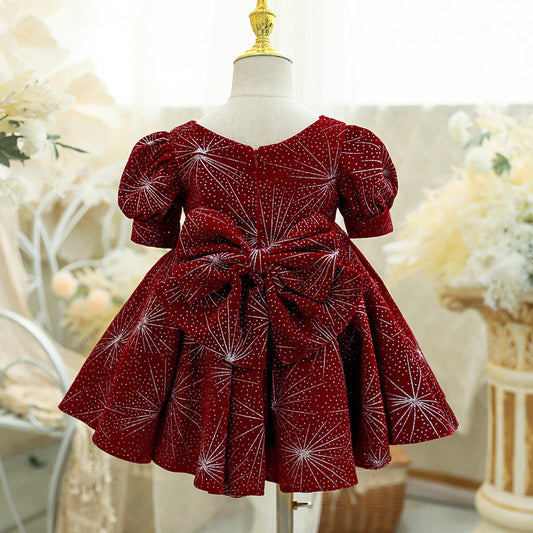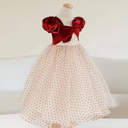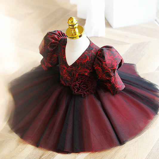 Burgundy Princess Flower Girl Dress Ruffle Pleated Puff Sleeve
