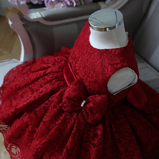 Burgundy Princess Lace Flower Girl Dress with Bow Embellishments