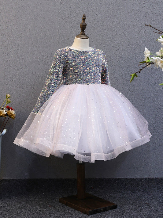 Princess Round Tea Length Tulle Flower Girl Dress in Dusty Blue