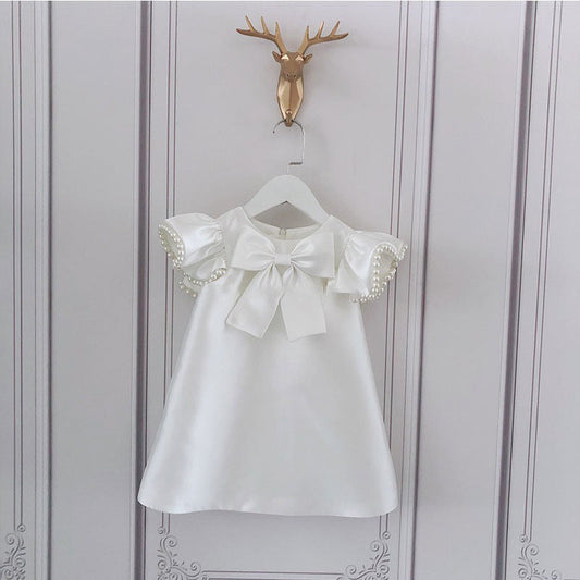 White Satin Ball Gown Flower Girl Dress with Beaded Bow