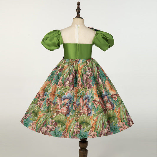 Avocado Green Floral Print Princess Dress with Illusion Neckline