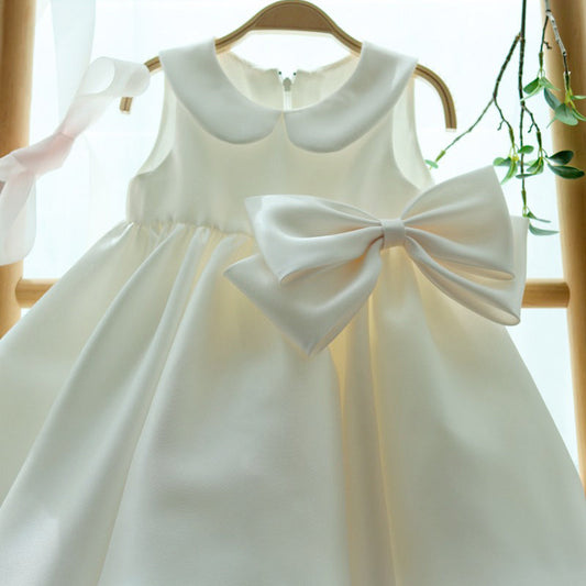 A-line Sleeveless Satin Tea-Length White Dress for Girls