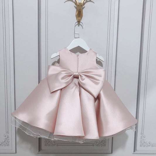 A-Line Sleeveless Satin Pink Dress with Bow for Girls