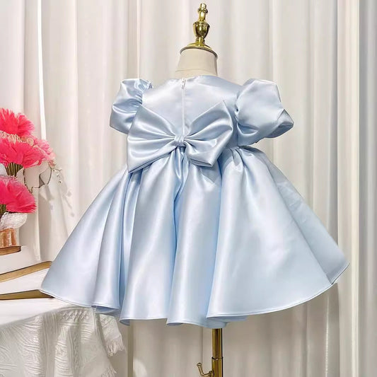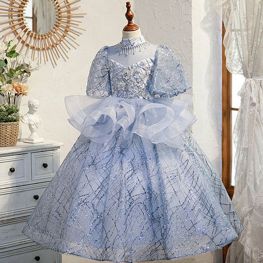 Robe de princesse à paillettes bleu poudré, volants, courte bouffante, longueur au sol