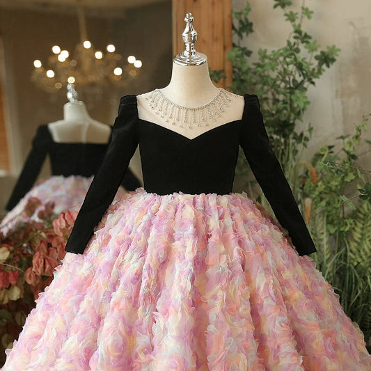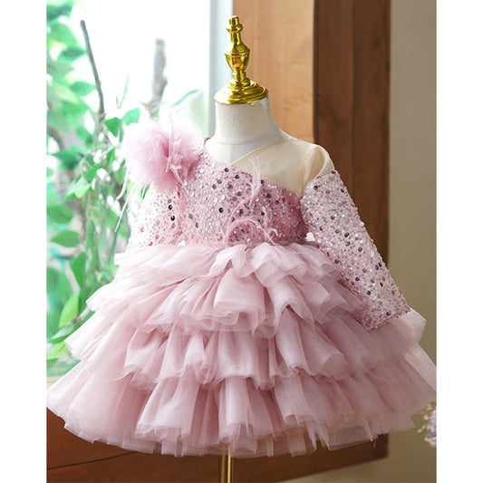 Robe de bal en tulle à sequins rose poudré, manches longues et volants, pour fille
