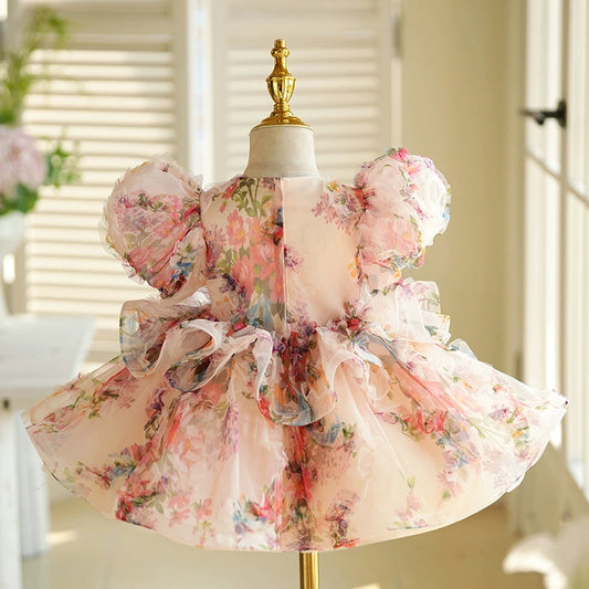 Robe de demoiselle d'honneur élégante à fleurs, coupe trapèze, avec manches bouffantes