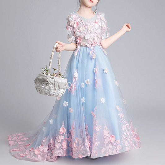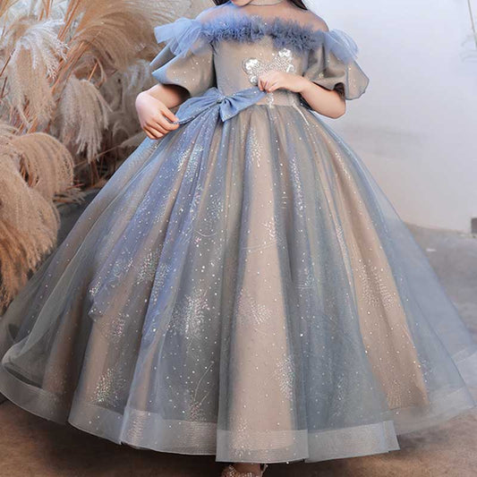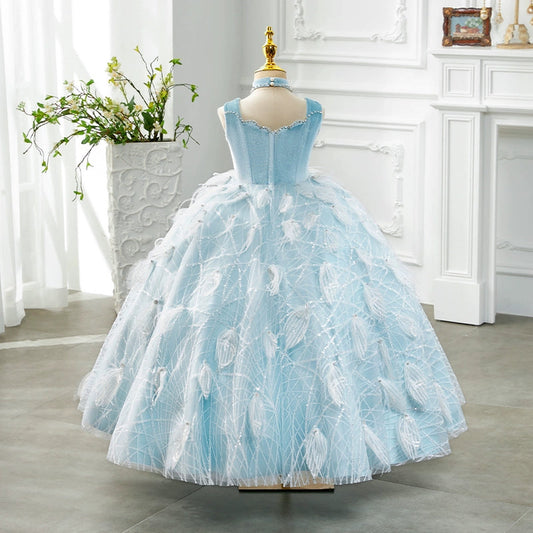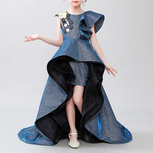 Robe de bal bleue mi-longue avec fleurs et franges pour fille