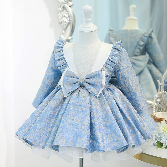 Robe de princesse en dentelle bleue pour fille : manches longues et nœud