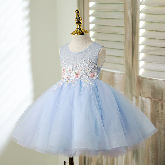 Robe de soirée bleue sans manches pour fille avec fleurs en tissu