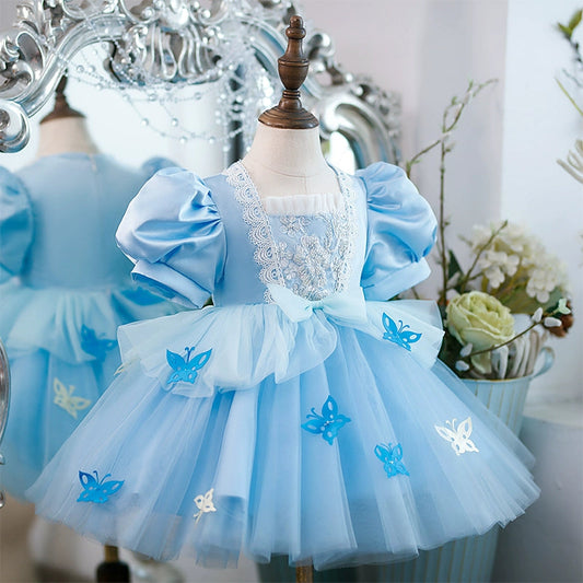 Robe de princesse en tulle et dentelle bleue pour fille, manches mi-longues, nœud