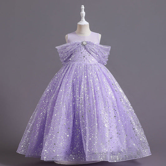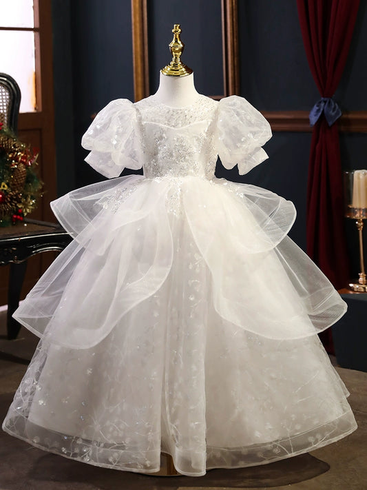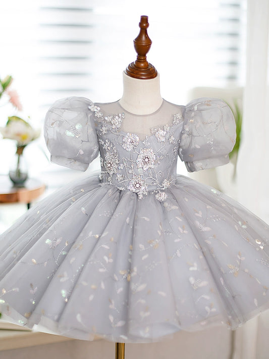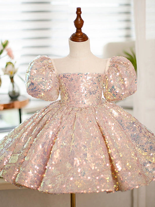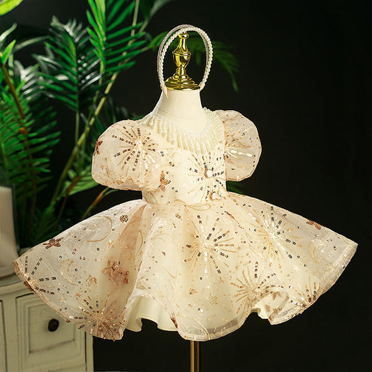 Robe de princesse à paillettes champagne pour fille avec manches bouffantes et perles