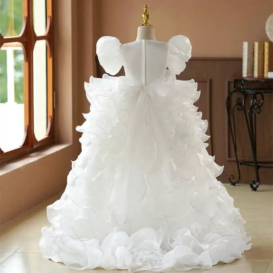 Robe de princesse blanche trapèze à volants et plis pour demoiselle d'honneur