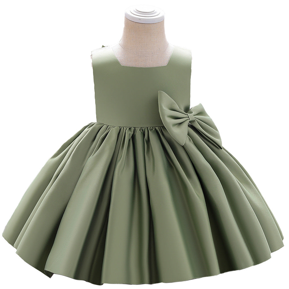Robe de demoiselle d'honneur en satin coupe trapèze, longueur thé, avec nœud et volants