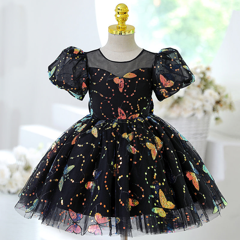 Black Sequin Princess Flower Girl Dress Short Puff Sleeve Knee