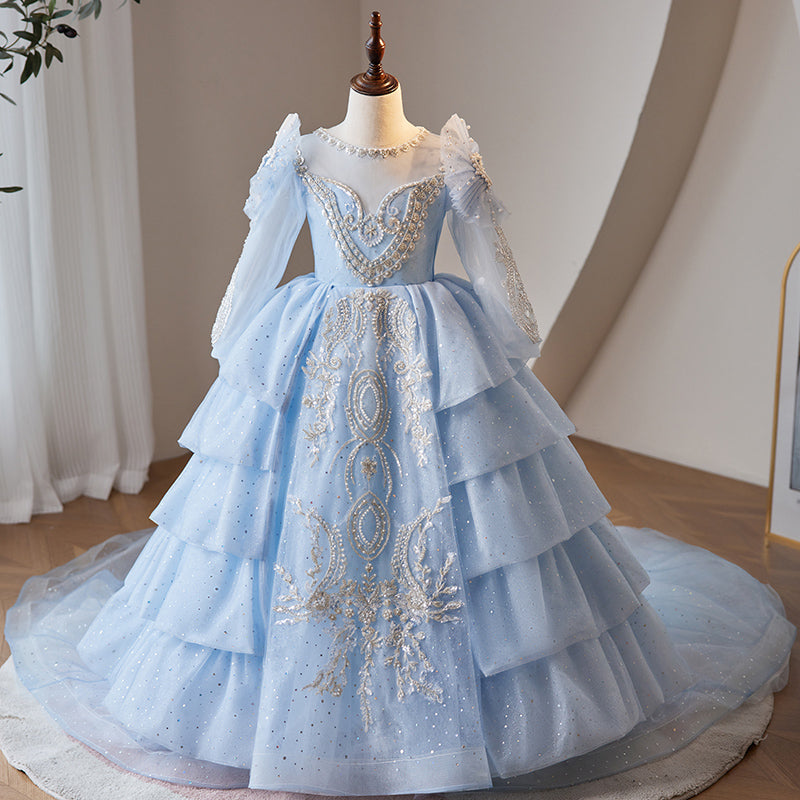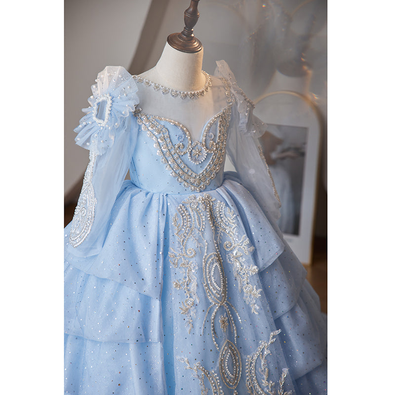 Blue Sequin Princess Flower Girl Dress with Beaded Puff Sleeves