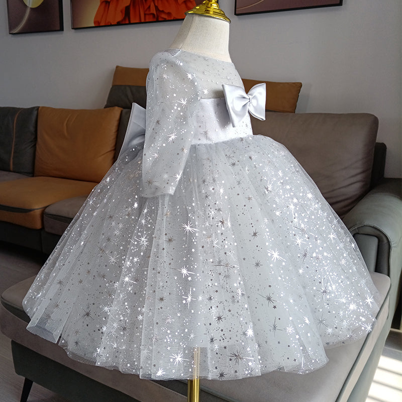 Princess Sequined Flower Girl Dress with Bow – Tea Length, Short Lantern Sleeves