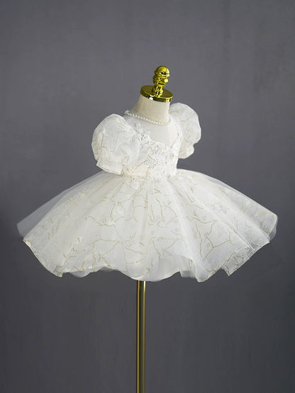 White Sequin Tulle A-Line Flower Girl Dress with Puff Sleeves