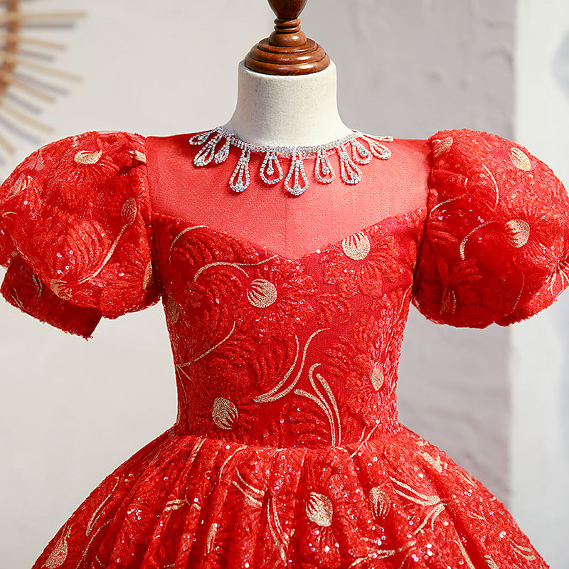Princess Sequined Flower Girl Dress with Bow – Tea Length, Short Lantern Sleeves