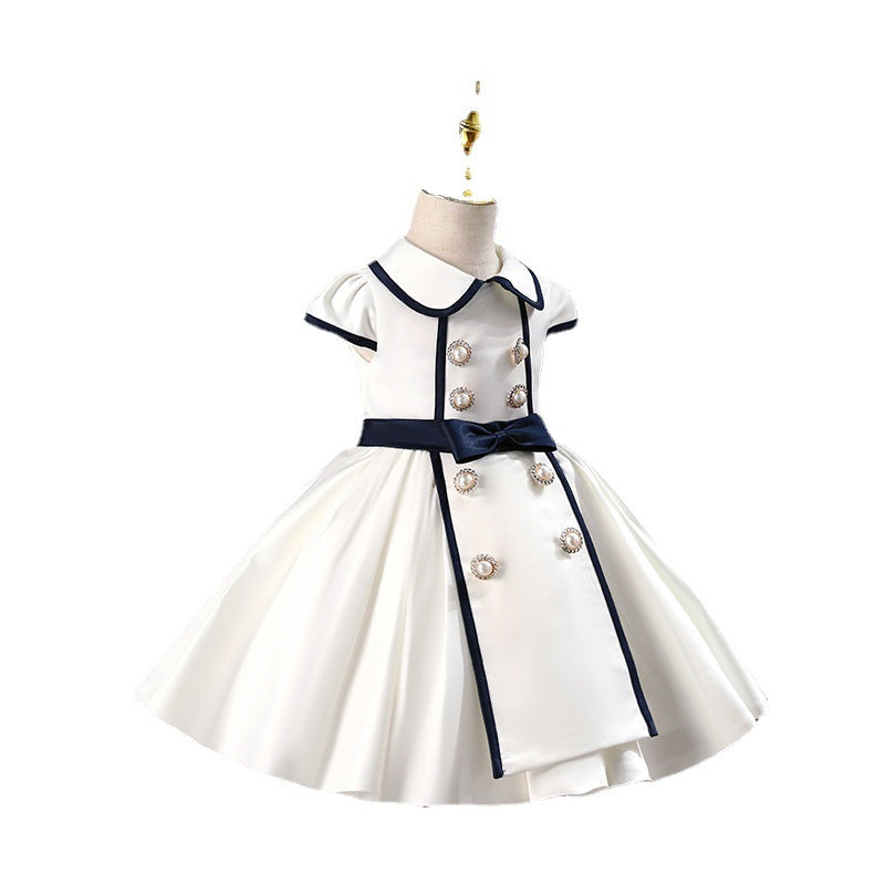 White Satin Princess Flower Girl Dress: Collared Cap Sleeve