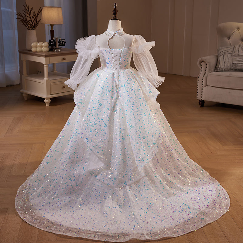 White Sequin A-Line Flower Girl Dress with Long Puff Sleeves