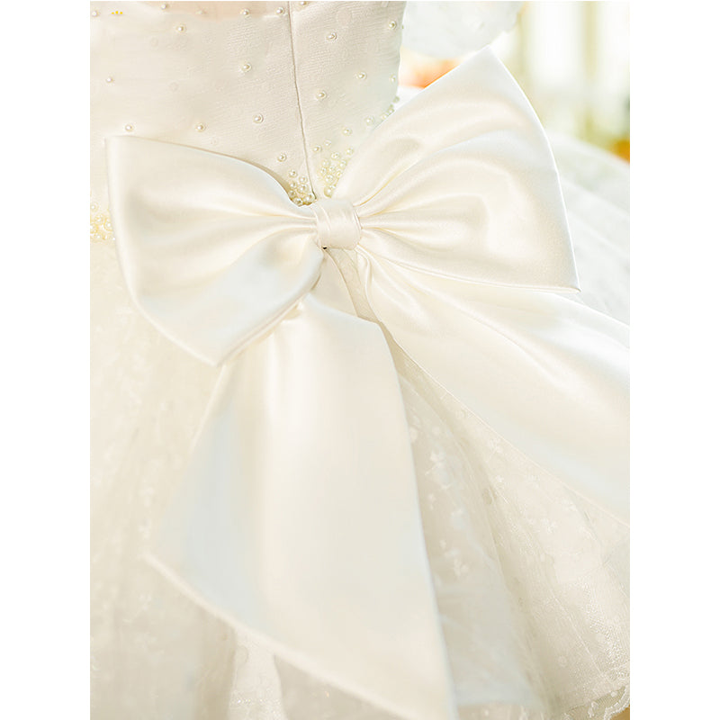 White Sequin Tulle Princess Flower Girl Dress Beaded Bow Knee