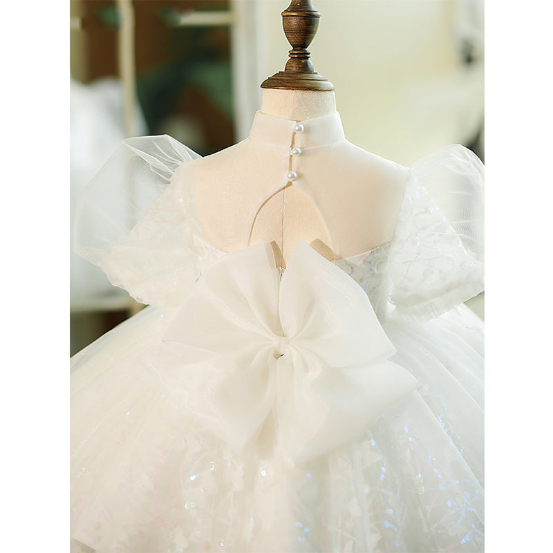 White Sequin Tulle Princess Flower Girl Dress Mock Neck Puff